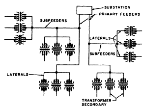 Figure 2-3.Radial distribution system. system. Since it is less costly to construct, the overhead system is more common. However, in some instances, such as near an airfield, an underground system may be required. This chapter will discuss mainly the overhead distribution system. Substations The distribution substation transforms the trans-mission voltage to the proper distribution voltage levels and protects the substation and transmission lines against faults occurring in the feeder circuits. At advanced bases, the source of power may be generators
