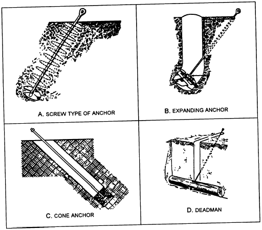 Figure 2-7.Anchors. proper anchoring and guying of pole lines is essential. These precautions also help to support poles that are set in sandy or swampy ground, and they counteract added strains caused by the elements, such as high winds, snow, and ice. Various types of guy anchors have been developed to hold imposed loads securely in varying soil conditions. Some of these types are shown in figure 2-7. There are many different uses of guys, some of which are shown in figures 2-8 through 2-13. Each usage has its own terminology as follows:1. DOWN GUYS. The most common type of guy is the down guy. With this type of guy, the wire is run from the top of the pole to an anchor in the ground. Some common uses of the down guys areas follows:a. SIDE GUY. A side guy (fig. 2-8) is used to reinforce a pole line against an unbalanced side pull of the conductors. Such pulls are developed at curves, angles, or sharp turns in the line.