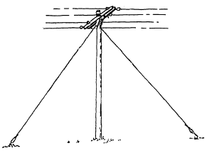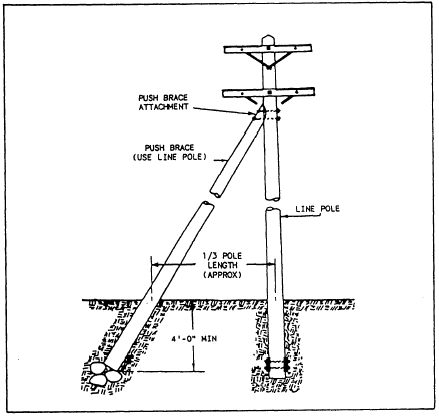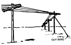 Figure 2-12.Head guy. 2. HEAD GUY. A head guy runs from one pole to the next pole down the line. It is used to transfer the load supported by one line pole to another, as shown in figure 2-12.3. PUSH BRACE. A push brace (fig. 2- 13) is used where a pole cannot be guyed and is too small to be self-sustaining. It is used in marshy or sandy soils where anchors cannot be firmly embedded. The upper end of the brace is bolted to the pole.