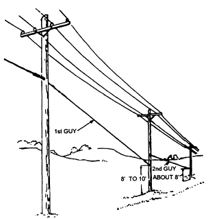Figure 2-10.Corner guy. b. TERMINAL DOWN GUY. As shown in figure 2-9, this type of guy is usually placed at the end of a pole line to counterbalance the pull of the line conductors. The terminal down guy can, at times, be called a corner guy.c. CORNER GUY. The corner guy (fig. 2-10) is used where there is a directional change in the line.d. LINE GUY. A line guy is installed in a straight pole line where an unusual stress or strain comes from farther down the pole line or where there is a chance the conductors may break and cause excessive damage. Many times, line guys are installed in pairs, as shown in figure 2-11. A line guy is often called a storm guy.