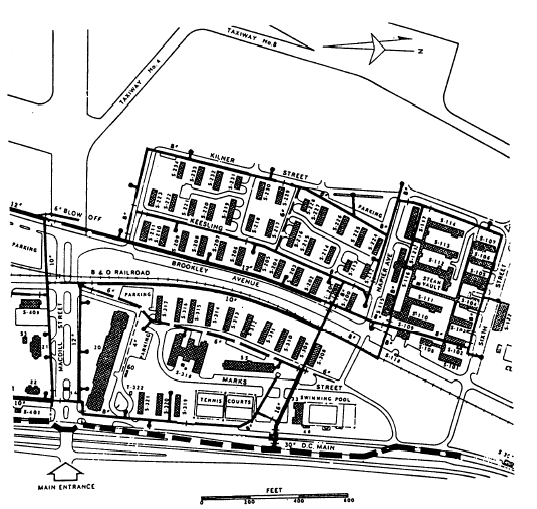 Figure 2-19.Typical distribution system layout. 3. STORAGE RESERVOIRS. Storage reservoirs are structures used to store water. They also equalize the supply or pressure in the distribution system. A common example of a storage reservoir is an aboveground water storage tank. 4. SYSTEM ACCESSORIES. System accessories include the following:a. BOOSTER STATIONS. Booster stations are used to increase water pressure from storage tanks for low-pressure mains.b. VALVES. Valves control the flow of water in the distribution system by isolating areas for repair or by regulating system flow or pressure.c. HYDRANTS. Hydrants are designed to allow water from the distribution system to be used for fire-fighting purposes.d. METERS. Meters record the flow of water in a part of the distribution system.e. SERVICE CONNECTIONS. Service connections are used to connect individual buildings or other plumbing systems to the distribution system mains.f. BACKFLOW PREVENTERS. A cross-connection is any connection between a potable and nonpotable water system through which a contaminating flow can occur. Backflow preventers, such as air gaps and vacuum breakers, are used to prevent flow through potential cross-connections. |
