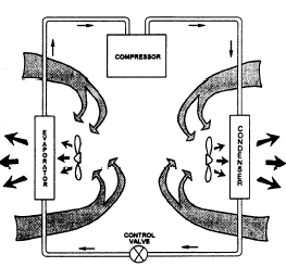 Figure 4-11.-Refrigerating cycle of a package type air-conditioning unit.floor-mounted units (fig. 4-10). Both types of units contain a complete system of refrigeration components. The window units need not be installed in windows. They also can be installed in transoms, or they can be framed into outside walls. The use of outside walls is important for proper performance. When the unit is operating, the compressor (fig. 4-11) forces a high-- pressure (high-temperature) refrigerant gas to the condenser. The condenser fan draws in and blows outside air over the condenser coils. This movement of the relatively cooler outside air over the hot condenser coils changes the gas to a liquid, giving off heat that is exhausted to the outside. The liquid then passes through a control device that regulates the flow of the liquid to the evaporator. In the evaporator, the liquid changes to a low-pressure (low-temperature) gas that is circulated through the evaporator coils. The inside or room air is then circulated by an evaporator fan over the cold evaporator coils. This action removes heat from the air and returns the cooled air back to the room. A variation of this type of unit is the heat pump. In a heat pump, the roles of the condenser and the evaporator can be reversed so that the unit draws in and heats outside air and expels cold inside air. In this way, the unit functions as a heating unit, rather than a cooling unit.Cooling Coils Most forced-air furnaces are designed for the addition of a cooling coil. The coil is placed on the output side of the furnace and uses a forced-air furnace blower to circulate the air over the cooling coils. The addition of a dehumidifier reduces moisture in the air. The cooling unit, placed in any convenient location outside the building, produces chilled water that is circulated through the cooling coils near the air-conditioned space. The air to be conditioned is then blown over the cooling coils and is cooled by the chilled water absorbing the heat from the air. The warmed water is then returned to the unit. Fan-Coil Units You have probably seen fan-coil units in a school or motel room. These units contain a fan, coil, falter, condensate drain, and sometimes, an outside-air inlet. A central unit furnishes air to the unit, and duct coils heat or cool the air. The amount of air moving over the coils and the temperature of the coils can be manually or thermostatically controlled. A piping system provides hot or cold water to each unit. |