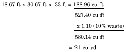 ESTIMATING BULK MATERIAL REQUIREMENTS All material estimates, including those for bulk materials, are used as a basis for material procurement and as a check to determine if sufficient materials are available to constructor complete a project. In general, the term bulk material refers to concrete, bituminous paving materials, and mineral products, such as sand, gravel, or rock. A few examples of estimating these materials are described below.Concrete Estimating the amount of concrete required for a project consists of determining the volume (in cubic yards or, in many locations outside the United States, in cubic meters) of the spaces that will be occupied by the concrete. As an example, lets look at figure 5-2. This figure shows the foundation plan and a typical foundation detail for a small 20 foot by 32 foot building. As shown in the detail, the foundation is continuous and the floor is a 4-inch-thick concrete slab. Our task is to determine the amount of concrete that will be required for the foundation and slab. Since in any concrete job a certain amount of concrete will be unavoidably lost during placement, we will include a 10-percent waste factor. You can find this waste factor listed in the P-405. Although we could proceed in various ways to estimate the amount of concrete that is required, an easy method is tabulated as follows:Foundation wall: (32.00 ft x .67 ft x 2 fi) x 2 = 85.76 cu ft (18.67 ft x .67 ft x 2 ft) x 2 = 50.04 cu ft Footing: (33.33 ft x 2 ft x 1 ft) x 2 = 133.032 cu ft (17.33 ft x 2 ft x 1 ft) x 2 = 69.32 cu ft Slab: