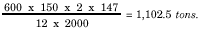 From the above tabulation, you can see that separate estimates were prepared for the foundation wall, footing, and slab. You can also see that both the foundation wall and the footing were further subdivided based on the length and width of the building; for example, the foundation wall consists of two walls measuring 32 feet long and two measuring 18 feet 8 inches long (allowing for overlap at the foundation corners). Then, the separate estimates were added together, the waste factor was applied, and the final cubic feet of concrete was converted to cubic yards. Now lets see how much compacted fill will be required for this job. For this example, we will assume that the project specifications call for sand to be used as the fill material.Figure 5-2 shows that the fill material is to be 8 inches thick after compaction. Therefore, the volume of the compacted fill is 383.65 cubic feet. However, from your knowledge of soils, you know that compacted sand occupies less volume than loose sand. Since the sand for this project will be delivered to the jobsite in a loose condition, a compaction factor must be applied. NAVFAC P-405 lists compaction factors for various materials. For sand, the compaction factor listed is 1.17. So, the total amount of sand required for this project is 383.65 x 1.17=448.87 cubic feet, or 16.6 cubic yards. Again, however, we know that a certain amount of sand will be wasted. So, lets increase the total by 10 percent. Now we need approximately 18 cubic yards of sand for the job.Bituminous Paving Although not always, most bituminous paving projects that are accomplished by the Seabees use hot-mixed bituminous concrete that is purchased from a central plant. In this case, the job of estimating consists of determining the compacted volume, in cubic feet, of the pavement. This volume is then multiplied by the unit weight of the mix, in pounds per cubic foot (pcf), and the final result is converted to tons of mix required. An equation for determining the required tons of mix can be expressed as follows:Tons of mix = Where: L= Length of paved area in feet W= Width of paved area in feet T= Compacted thickness of the pavement in inches UW = Unit weight of the mix in pounds per cubic footTo illustrate the use of this formula, lets assume that we are estimating a 2-inch-thick hot-mix bituminous pavement on a 150-foot by 600-foot parking lot. The unit weight (which usually ranges from 140 to 160 pcf) should be determined from laboratory testing when possible; however, when the unit weight is not known, an estimated weight of 160 pcf maybe used. In this example, lets assume a unit weight of 147 pcf. From this, we can estimate the tons of plant mix required by substitution into the above formula as follows: