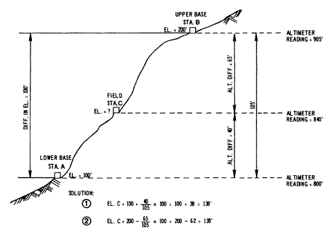 Then this result is added to the elevation of Sta. A, as shown in solution No. 1, figure 7-1. If we use the upper base as a reference, you compute the difference in elevation by using the same method; but to compute from Sta. B, subtract the result, as shown in solution No. 2, figure 7-1.For a more accurate result, altimeter surveys should be made on days when there is not much variation in barometric pressure. Windy days when detached clouds are traveling rapidly should be avoided because alternating sunlight and shade over the survey area can cause fluctuations in the altimeter reading. Steady barometric pressures generally occur on days with gentle winds and an overcast sky. The recommended time for observations is 2 to 4 hours after sunrise and 2 to 4 hours before sunset. Midday observation must be avoided if possible. Remember, you must shade the instrument at all times, and you must avoid jarring the instrument suddenly during its transfer from one station to another |