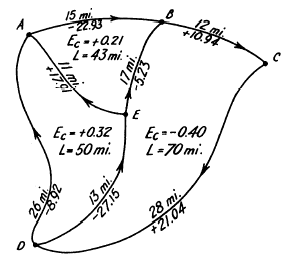 Figure 7-5.Adjustmmt of level nets. For circuit BCDEB, the error of closure is 0.40 ft. This is distributed among the lines in proportion to their lengths. Thus, for the line BC, the correction is