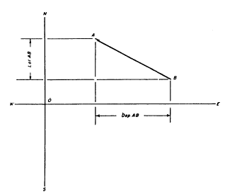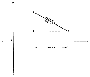 Figure 7-10.Departure equals length of traverse line times sine of angle of bearing.The departure of a traverse line, then, equals the length of the line times the sine of the angle of bearing. The latitude of a traverse line is designated north or south and the departure is designated east or west following the compass direction of the bearing of the line. A line bearing northeast, for example, has a north latitude and east departure. In computations, north latitudes are designated plus and south latitudes minus; east departures are designated plus and west departures minus.