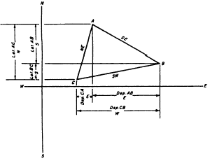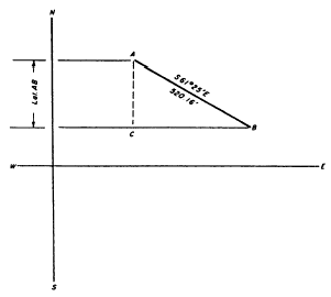 Figure 7-9.Latitude equals length of traverse line times twine of angle of bearing.
