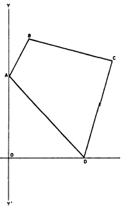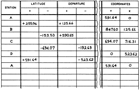 Figure 7-26.First step for tabulated computation of figure 7-24. Figure 7-25 shows the coordinate entries. You can see that the Y coordinate of A equals the latitude of DA, or 591.64 feet, while the X coordinate of A is zero. The Y coordinate of B equals the Y coordinate of A plus the latitude of AB or 591.64 + 255.96 = 847.60 feet.The X coordinate of B equals the departure of AB, or 125.66 feet. The Y coordinate of C equals the Y coordinate of B minus the latitude of BC or 847.60 153.53 = 694.07 feet.The X coordinate of C equals the X coordinate of B plus the departure of BC or 125.66 + 590.65 = 716.31 feel.The Y coordinate of D obviously is zero; however, it computes as the Y coordinate of C minus the latitude of CD of 694.07 694.07, which serves as a check. The X coordinate of D equals the X coordinate of C minus the departure of CD or 716.31 192.69 = 523.62 feet. This is the same as the departure of DA, but with an opposite signa fact which serves as another check.