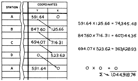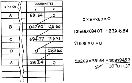Figure 7-27.Second step for tabulated computation of figure 7-24. Figures 7-26 and 7-27 show the method of determining the double area from the coordinates. First, multiply pairs of diagonally opposite X and Y coordinates, as shown in figure 7-26, and determine the sum of the products. Then, multiply pairs diagonally in the opposite direction, as shown in figure 7-27, and determine the sum of the products. The difference between the sums (shown in fig. 7-26) is the double area or 1,044,918.76 397,011.37 = 647,907.39 square feet The symbol shown beside the sum of the coordinate products is the capital Greek letter (S) sigma In this case, it simply means sum. |