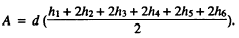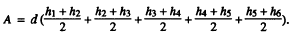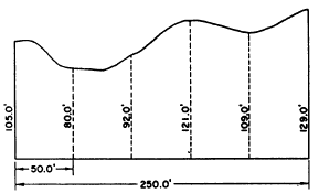 Figure 7-28.Area of irregular figure by trapezoidal rule. line. For illustration purpose, let us assume that figure 7-28 is a parcel of land in which the south, east, and west boundaries are straight lines perpendicular to each other, but the north boundary is a meandering shoreline. To determine the area of this figure, first lay off conveniently equal intervals (in this case, 50.0-foot intervals) from the west boundary and erect perpendiculars as shown. Measure the perpendiculars. Call the equal interval d and the perpendiculars (beginning with the west boundary and ending with the east boundary) hl through h2.Now, you can see that for any segment lying between two perpendiculars, the approximate area, by the rule for determining the area of a trapezoid, equals the product of d times the average between the perpendiculars. For the most westerly segment, for example, the area is The total area equals the sum of the areas of the segments; therefore, since d is a factor common to each segment, the formula for the total area may be expressed as follows:
