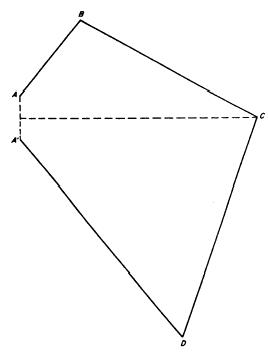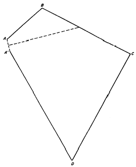 Figure 7-42.Graphical method to locate angular mistake in a closed traverse (see angle A).A perpendicular bisector from AA' points directly at the faulty angle C.If a perpendicular bisector from the line of linear error of closure does not point at any angle, the faulty angle may lie at the point of the beginning of the traverse. In figure 7-42, the bearings of all lines are correct for closure except that of the initial line AB. Line AB should be N2909'E for closure but was plotted N1609'E. A perpendicular from AA' does not point at any angle in the traverse.OUTSIZED LATITUDE AND/OR DEPARTURE ERROR OF CLOSURE. When both the latitudes and departures fail to close by large amounts, there is probably a mistake in an angle or a distance. When one closure is satisfactory and the other is not, a computational mistake is probably the cause of the outsized closure error. |
