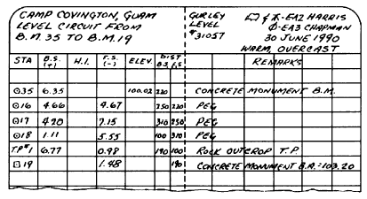 Figure 7-46.Closed traverse for use with question Q8. A1. Barometric leveling and trigonometric leveling. A2. (A) 398.303 meters, (B) 46.506 meters. (If your answer to Part A is incorrect, then you should review Engineering Aid 3, pages 12-18 and AIII-13.)A3. (A) 0.08 feet, (B) no. A4. (A) 0.21 feet, (B) +23.02 feet. A5. 0 feet. A6. 1/959 (or 1/1,000). A7. N4745E. A8. 8,520 square feet. |