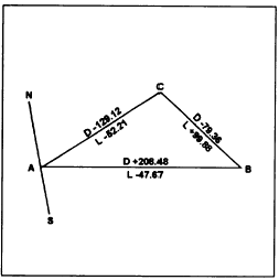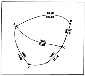 Figure 7-45.Level net for use in answering question Q4. Q4. Refer to the level circuit ABCA shown in figure 7-45. What is (a) the error of closure in the circuit, and (b) the corrected difference in elevation (cycle I) for line AB? Q5. What is the latitude of a 300-foot traverse line running due east and west? Q6. Assume that you are working with a traverse that has a total length of 2,541.35 feet, an error of closure in latitude of 1.73 feet, and an error of closure in departure of +2.01 feet. What is the ratio of error of closure? Q7. Compute the bearing of traverse line AB when the coordinates of station A and B are follows: Station A: X = 627.42, Y= 326.87 Station B: X = 864.81, Y= 542.50 Q8. Refer to figure 7-46. What is the approximate area contained within the traverse?