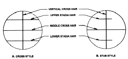 Figure 8-2.-Stadia hairs. 1. measure the angle and distance from transit stations 2. measure angles from two transit stations 3. measure distances from two known points 4. measure an angle from one station and distance from another station 5. measure swing offsets and range ties As you can well imagine, detailing by transit and tape is a time-consuming process that requires chaining many distances and taking many level shots. This is necessary when a high degree of accuracy is required. However, for lower-precision (third and fourth order) surveys, a less time-consuming method is to locate the details by transit and stadia. LOCATING DETAILS BY TRANSIT AND STADIA As an EA, most of the topographic surveying that you will do is of a lower degree of accuracy that is well suited to the transit and stadia method. When you are using this method, horizontal distances and differences in elevation are indirectly determined by using subtended intervals and angles observed with a transit on a leveling rod or stadia board To explain the meaning of this, we will first discuss the principles of stadia and then look at field procedures that are used in stadia work. Stadia Equipment Terms, and Principles The following discussion will familiarize you with the equipment, terminology, and principles used in stadia surveying. Although this discussion of stadia surveying is included in this chapter on topography, you should be aware that stadia can be used in any situation in which it is desired to obtain horizontal distances and differences in elevation indirectly. The results, though, are of a lower order of precision than is obtainable by taping, EDM, or differential leveling. However, the results are adequate for many purposes, such as lower-order trigonometric leveling. A thorough understanding of stadia is highly important to any surveyor. You should supplement the knowledge that you gain from the following discussion by reading other books, such as Surveying Theory and Practice, by Davis, Foote, Anderson, and Mikhail.STADIA RODS. Where sight distances do not exceed 200 feet, a conventional rod, such as a Philadelphia rod, is adequate for stadia work. For longer distances, however, you should use a stadia rod. Stadia rods usually have large geometric designs on them so that they may be read at distances of 1,000 to 1,500 feet or even farther. Some rods do not have any numerals on them. From the geometric pattern on the rod, you can observe intervals of a tenth of a foot and sometimes a hundredth of a foot.Stadia rods generally are 10 to 15 feet long, 3 to 5 inches wide, and about 3/4 inch thick. They may be made in one piece or in sections for ease in carrying them. Some stadia rods are flexible and maybe rolled up when not in use. Flexible rods are merely graduated oilcloth ribbons, tacked to a board. Some examples of stadia rods are shown in chapter 11 of the EA3 TRAMAN. STADIA HAIRS. The telescope of transits (as stadia hairs, that are in addition to the regular vertical and horizontal cross hairs. Figure 8-2 shows two types of stadia hairs as viewed through a telescope. As shown in this figure, one stadia hair is located above and the other an equal distance below the horizontal (or middle) cross hair. On most equipment, the stadia hairs are not adjustable and remain equally spaced.STADIA INTERVAL. As you look at a stadia rod through a transit telescope, the stadia hairs seem to intercept an interval on the rod. The distance on the rod between the apparent positions of the two stadia hairs is the stadia interval or stadia reading.Usually, you determine stadia intervals by sighting the lower stadia hair at a convenient foot mark and then observing the position of the upper stadia hair; for example, the lower hair might be sighted on the 2.00 foot mark and the upper hair might be in line with 6.37. By subtracting, we have the stadia reading (6.37 -2.00 = 4.37). It may happen that the stadia reading is more than the length of the rod. By using the middle hair, you may observe a half-interval and multiply it by 2 to get the stadia reading. STADIA CONSTANT. Light rays that pass through the lens (objective) of a telescope come together at a point called the principal focus of the lens. Then these light rays continue in straight-line paths, as shown in figure 8-3.The distance between the principal focus and the focal length(f) of the lens. (i), you get a number known as the stadia constant (k). Sometimes the stadia constant is called the stadia factor or stadia interval factor. A convenient value to use for the stadia constant is 100. Stadia hairs usually are spaced so that the interval between them will make the stadia constant equal to 100. STADIA DISTANCE. The distance from the stadia As shown in figure 8-3, this distance (d) is