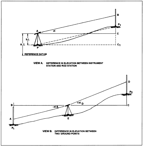 Figure 8-9.-Difference in elevation. you can see, when the center cross hair is sighted on a rod graduation that is equal to the h.i. before reading the vertical angle, then calculating the difference in elevation is greatly simplified. Obviously, though, if the line of sight is obstructed and you cannot sight on a rod graduation that is equal to the hi., then you must sight on some other graduation.Another, although less frequent, occurrence in topographic work using stadia is shown in figure 8-9, view B. In this situation it is desired to determine the difference in elevation between two points on the ground (P1 and P2) from an instrument station (E) that is located between the two points.For this discussion, let us assume that a backsight is taken on a rod held at P1 and then a foresight is taken to P2. Now the difference in elevation (DE) between the two points can be written as follows: