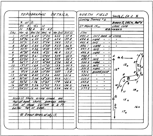 Figure 8-10.-Notes for locating topographical details by transit and stadia. Now let us see how all that you have learned about transit-stadia topography is used in the field Figure 8-10 shows field notes for locating topographic details by transit and stadia. The details shown by numbers in the sketch on the Remarks side are listed on the data side by numbers in the column headed Obj. At the top of the page on the data side, you see that control point D1 was used as the instrument station. Immediately below this, you see that from instrument-station D1, the transit was backsighted to point A and that all horizontal angles were measured to the right from the backsight on A. In the third line from the top on the data side, you see that the known elevation of D1 is 532.4 feet and that the vertical distance (hi.) from the point or marker at D1 to the center of the instrument above D1 is 4.8 feet. This vertical distance was carefully determined by measurement with a tape or rod held next to the instrument.Now let us see how each of the objective points was detailed. We will begin with point 1. Remember that in this example, D1 is the instrument station from which all observations are made.To determine the direction of point 1, train the transit telescope on A and match the zeros. Next turn the telescope right to train on point 1 and read the horizontal angle (30010).