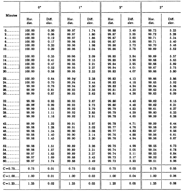 Figure 8-11.-Horizontal distances and elevations from stadia readings. For the horizontal distance and elevation of point 1, set a rod on the point, and train the lower stadia hair of the transit telescope on a whole-foot mark on the rod so that the center hair is near the 4.8 graduation. (This is a common practice in stadia work that makes reading the stadia interval easier.) Then read and record the stadia interval (in this case 6.23 feet). Next, rotate the telescope about the horizontal axis until the center hair is on the 4.8 rod graduation. Lock the vertical motion and read and record the vertical angle (-3026). Be sure to record each vertical angle correctly as plus or minus. While you are reading and recording the vertical angle, the rodman can be moving to the next point. This will help speed up the survey. From the stadia interval and the vertical angle reading, the horizontal distance (entered in the fifth column of fig. 8-10) and the difference in elevation (in the sixth column) are determined from a stadia reduction table. Figure 8-11 shows the page from a stadia reduction table that applies to the data for point 1 in figure 8-10. For this point, the vertical angle is 326, and the stadia interval is 6.23 feet. In the table under 3 and opposite 26, note that the multiplier for horizontal distance is 99.64, while the one for difference in elevation is 5.98. If the final distance is ignored, the horizontal distance is The difference is elevation is