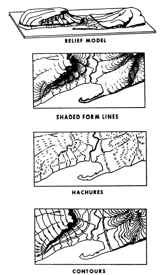 Figure 8-12.-Methods of indicating relief. vertical distance between adjacent contour lines is known as the contour interval. Starting at zero elevation the topographer draws every fifth contour line with a heavier line. These are known as index contours. At some place along each index contour, the line is broken and its elevation is given. The contour lines falling between index contours are called intermediate contours. They are drawn with a finer line than the index contours and, usually, do not have their elevations given. Examples of index contours and intermediate contours are shown in figure 8-13. |