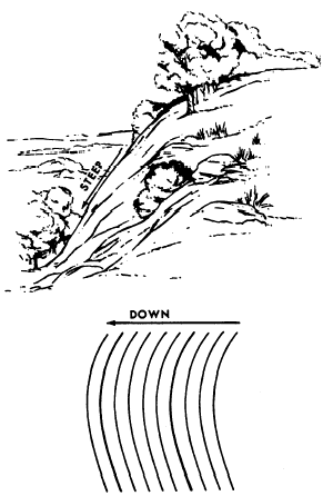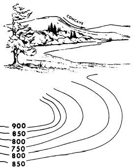 Figure 8-21.-Concave slope. that appears on the map completely closed may indicate either a summit or a depression. If the line indicates a depression, this fact is sometimes shown by a succession of short hachure lines, drawn perpendicular to the inner side of the line. An example of a depression is shown in figure 8-18. A contour line marked in this fashion is called a depression contour.On a horizontal or level plane surface, the elevation of all points on the surface is the same. Therefore, since different contour lines indicate different elevations, there can be no contour lines on a level surface. On an inclined plane surface, contour lines at a given equal interval will be straight, parallel to each other, and equidistant.A number of typical contour formations are shown in figure 8-18. For purposes of simplification, horizontal scales are not shown; however, you can see that various intervals are represented. The arrows shown indicate the direction of slope. Generally, the spacing of the contour lines indicates the nature of the slope. Contour lines (fig. 8-19) that are evenly spaced and wide apart indicate a uniform, gentle slope. Contour lines (fig. 8-20) that are evenly spaced and close together indicate a uniform, steep slope. The closer the contour lines are to each other, the steeper the slope. Contour lines closely spaced at the top and widely spaced at the bottom indicate a concave slope (fig. 8-21).