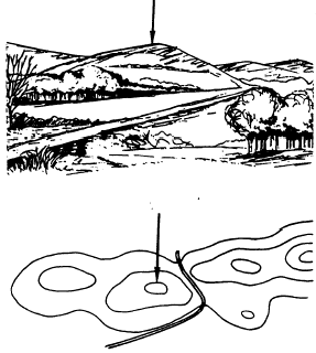 Figure 8-23.-Hill. Contour lines widely spaced at the bottom indicate a convex slope (fig. 8-22).A panoramic sketch is a pictorial representation of the terrain in elevation and perspective as seen from one point of observation. This type of map shows the