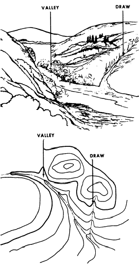 Figure 8-24.-Valley and draw. horizon, which is always of military importance, with intervening features, such as crests, woods, structures, roads, and fences. Figures 8-23 through 8-29 show panoramic sketches and maps. Each figure shows a different relief feature and its characteristic contour pattern. Each relief feature illustrated is defined in the following paragraphs.A hill is a point or small area of high ground (fig. 8-23). When you are on a hilltop, the ground slopes down in all directions.A stream course that has at least a limited extent of reasonably level ground and is bordered on the sides by higher ground is a valley (fig. 8-24). The valley, generally, has maneuvering room within it. Contours indicating a valley are U-shaped and tend to parallel a major stream before crossing it. The more gradual the
