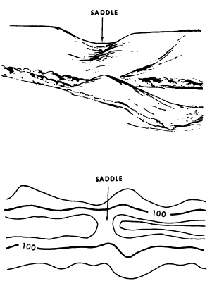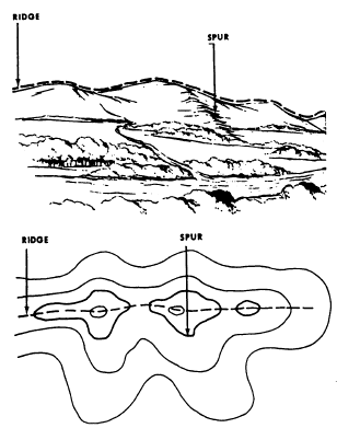 Figure 8-25.-Ridge and spur. fall of a stream, the farther each contour parallels it. The curve of the contour crossing always points upstream. A draw is a less-developed stream course where there is essentially no level ground and, therefore, little or no maneuvering room within its sides and towards the head of the draw. Draws occur frequently along the sides of ridges at right angles to the valley between them. Contours indicating a draw are V-shaped with the point of the V toward the head of the draw. A ridge is a line of high ground that normally has minor variations along its crest (fig. 8-25). The ridge is not simply a line of hills; all points of the ridge crest are appreciably higher than the ground on both sides of the ridge. A spur is usually a short continuously sloping line of higher ground normally jutting out from the side of a ridge (fig. 8-25). A spur is often formed by two roughly parallel streams that cut draws down the side of the ridge. A saddle is a dip or low point along the crest of a ridge. A saddle is not necessarily the lower ground between the two hilltops; it maybe simply a dip or break along an otherwise level ridge crest (fig. 8-26).A depression is a low point or sinkhole, surrounded on all sides by higher ground (fig. 8-27).