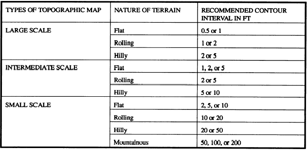Table 8-1.-Recommended Contour IntervalsTopographic Map Cuts and fills are man-made features that result when the bed of a road or railroad is graded or leveled off by cutting through high areas and filling in low areas along the right-of-way (fig. 8-28).A vertical or near vertical slope is a cliff. As described previously, when the slope of an inclined surface increases, the contour lines become closer together. In the case of a cliff, the contour lines can actually join, as shown in figure 8-29. Notice the tick marks shown in this figure. These tick marks always point downgrade. |