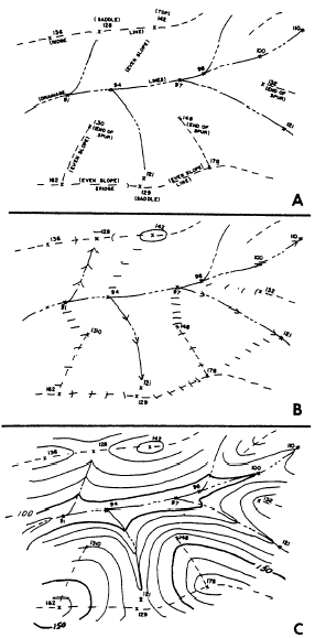 Figure 8-30.Plotting detail and contouring. points or contour points will be used as guides for the proper location of the contour lines.3. Construct contour lines at given contour intervals.Take special care, in the field, to locate ridge and valley lines because you usually draw these lines first on the map before plotting the actual contour points. (See fig. 8-30, view A.) Since contours ordinarily change direction sharply where they cross these lines and the slopes of ridges and valleys are fairly uniform, these lines aid you in drawing the correct contour lines. After the ridge and valley lines are plotted, space contour crossings (by interpolation) along them before