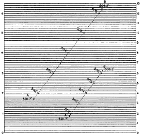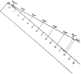 Figure 8-33.Graphic method of interpolating contour lines. For a steeper slope, the contour lines would be closer together. If the contour lines were too close, you might find it advisable to give the numbers on the graphic sheet different values, as indicated by the numerals in the right-hand margin. Here the space between each pair of lines represents not 0.1 foot, but 0.2 foot. Points A and B have the same elevations as points A and B, but the fact that the horizontal distance between them is much shorter shows that the slope between them is much steeper. You can see how the 1-foot contours between A and B can be located, using the line values shown in the right margin.A third method of rapid interpolation involves the use of a rubber band, marked with the correct, equal decimal intervals. The band is stretched to correct bring the graduations on the points. |
