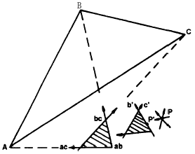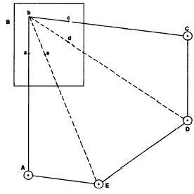 Figure 9-5.Three-point method of resection. three rays will intersect at a single point. Usually, however, the first orientation is not accurate, and the rays intersect at three points (ab, bc, and ac) forming a triangle, known as the triangle of error.From the geometry involved, the location of the desired point, P, must fulfill the following three conditions with respect to the triangle:1. It will fall to the same side of all three rays; that is, either to the right or to the left of all three rays.2. It will be proportionately as far from each ray as the distance from the triangle to the respective plotted point.3. It will be inside the triangle of error if the triangle of error is inside of the main plotted triangle and outside the triangle of error if it is outside the main triangle.In figure 9-5, notice that the triangle of error is outside the main triangle, and almost twice as far from B as from A, and about equally as far from C as from B. The desired point, P, must be about equidistant from the rays to B, and to C, and about one half as far from the ray to A, and the three measurements must be made to the same side of the respective rays. As drawn, only one location will fulfill all these conditions and that is near P. This is assumed as the desired location. The plane table is reoriented using P and back-lighting on one of the farther points (B). The new rays (a, b, and c) are drawn. Another (smaller) triangle of error results. This means that the selected position, P, was not quite far enough. Another point, P, is selected using the above conditions, the table is reoriented, and the new rays are drawn. If the tri- angle had become larger, a mistake was made and the selected point was on the wrong side of one of the rays. The directions should be rechecked and the point reselected in the proper direction.The new point, P, shows no triangle of error when the rays are drawn. It can be assumed to be the desired location of the point over which the plane table is set. In addition, the orientation is correct. Using a fourth known and plotted point as a check, a ray drawn from that point should also pass through P. If not, an error has been made and the process must be repeated.Normally the second or third try should bring the triangle of error down to a point. If, after the third try, the triangle has not decreased to a point, you should draw a circular arc through one set of intersections (ab, ab) and another arc through either of the other sets (bc, bc, or ac, ac). The intersections of the two arcsP. This intersection is used to orient the plane table. A check on a fourth location will prove the location.TRACING-CLOTH METHOD. Another method you can use to plot the location of an unknown point from three known points is the tracing-cloth method of resection. Figure 9-6 illustrates this method.In the figure, points a, b, and c are the plotted positions of three corresponding known stations (A, B, and C). P is the point of unknown location over which the plane table is set. To plot the location of P you first place a piece of tracing paper (or clear plastic) over the map and select any convenient point on the paper as P. Then you draw rays from P toward the three known stations. Next, you loosen the tracing paper and shift it until the three rays pass through the corresponding plotted points a, b, and c. The intersection of the rays marks the location of P, which can be pricked through the tracing paper to locate the point on the map. |