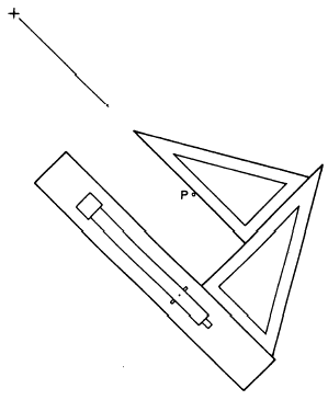 PLANE-TABLE POINTERS One of the troublesome problems in operating a plane table is the difficulty of keeping the alidade blade on the plotted position of the occupied point, such as P in figure 9-9. As the alidade is moved to sight a detail, the edge moves off point P. A solution some-times tried is to use a pin at P and pivot around it, but a progressively larger hole is gouged in the paper with each sight. To eliminate this problem, use two tri-angles to draw a parallel line with the straightedge of the telescope over pivot point P. The small error produced by the eccentric sight is no greater than that resulting from not being exactly over the ground point, P, or even that caused by the telescope axis not being over the edge of the blade.Other pointers that may be helpful concerning the use of the plane table are as follows:1. Use buff or green detail paper to lessen the glare.2. Plot and ink the traverse in advance of the detailing, showing lengths of traverse lines; coordinates of triangulation stations, if known; and useful signals