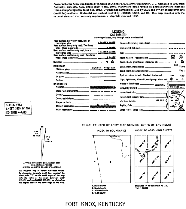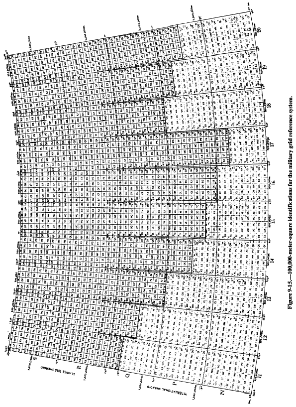 Figure 9-14.(A) Grid zone designations of the military grid reference system; (B) 100,000-meter-square designations in the UTM military grid system,Starting at the 180th meridian and progressing eastward by the compass, the earths surface is divided into a succession of north-south zones, each extending for 6 degrees of longitude. These zones are numbered from 1 through 60. Between latitude 80S and 84N, each zone is divided into a succession of east-west rows, each containing 8 degrees of latitude, with the exception of the northernmost row, which contains 12 degrees of latitude. Rows are designated by the letters C through X, with the letters I and O omitted. The lettering system begins at the southernmost row and proceeds north. For a particular zone-row area, the designation consists of first, the zone number and next, the row letter, such as 16S, which means row S in zone 16.The polar regions (that is, the areas above 84N and below 80S) have only two zones in each area. These lie on either side of the 0-degrees and 180- degrees meridian. In the North Polar region, the half of the region that contains the west longitudes is zone Y; that containing the east longitudes is zone Z. No numbers are used with these designations. Similarly, in the South Polar region, the half containing the west longitudes is zone A; that containing the east longitudes, zone B.In the UTM Military Grid System, a particular point on the earth is further identified by the 100,000- meter square in which it happens to lie. Each of the 6-degree longitude by 8-degree latitude zone-row areas in the system is subdivided into squares measuring 100,000 meters on each side. Each north-south column of 100,000-meter squares is identified by letter as follows. Beginning at the 180th meridian and proceeding eastward, you will find six columns of full squares in each 6-degree zone. Besides the full columns, usually partial columns also run along the zone meridians. The partial columns and full columns in the first three zones are lettered from A through Z, again with the letters I and O omitted. In the next time zones, the lettering systems begins over again. Observe, for example, figure 9-14, view B. This figure shows the zone-row areas in 1N, 2N, and 3N, and 1P, 2P, and 3P. The zone meridians shown are 180W, 174W, 168W, and 162W; the zone-row parallels shown are the equator (0 latitude), 8N, and 16N. The first 100,000-meter-square column to the east of 180 degrees is the partial column A. Next comes six full columns: B, C, D, E, F, and G. Then comes partial column H, to the west of the zone meridian 174W. The first column to the east of zone meridian 174W is partial column J; then comes the full-size columns K, L, M, N, P, and Q, followed by partial column R. To the east of zone meridian 168W,A through V, again with I and O omitted. For columns in the odd-numbered zones, the first row of squares north of the equator has the letter designation A; for columns in the even-numbered zones, the first row of squares north of the equator has the letter designation F. Rows above and below this row are designated alphabetically. The first row south of the equator in the odd-numbered zones, for example, has the letter designation V, while the first row south of the equator in the even-numbered zones has the letter designation E.The complete designation for a particular 100,000-meter square consists of the number-letter, zone-row designation plus the two-letter, 100,000- meter-square designation. For example, the designation 1NBA means the first full square east of the 180th meridian and north of the equator (square BA) in zone-row 1N, as shown in figure 9-14, view B. If you know the latitude and longitude of a certain point on the earth, you can determine the designation of the 100,000-meter square in which the point lies. Take Fort Knox, Kentucky, for example, which lies approximately at latitude longitudeYou will find this latitude and longitude in figure 9-15. The point lies in column 16, row S, and 100,000-meter square ES; therefore, the 100,000- meter-square designation for Fort Knox, Kentucky, is 16SES. The location of a particular point within a 100,000-meter square is given by naming the grid coordinates of the 100-meter square (or, for more precise location, of the 10-meter square) in which the point lies. Within each zone the point of origin for measuring these coordinates is the point of intersection between the zone central meridian and the equator. A false easting of 500,000 meters, instead of a value of O meters, is assigned to the central meridian to avoid the use of west or negative east-west coordinates. For points in the earths Southern Hemisphere, the equator is assigned a false northing of 10,000,000 meters to avoid the use of south or negative north-south coordinates, and northing values decrease from the equator toward the South Pole. For points in the Northern Hemisphere, the equator has a coordinate value of 0 meters, and northing values increase toward the North Pole.