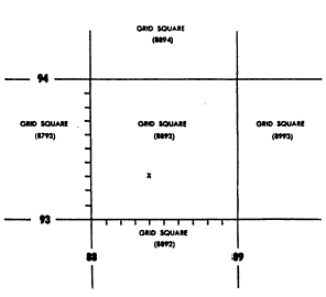 Figure 9-17.-Division of a grid square. omitted; for example, the grid location of the bullion depository at Fort Knox may be given as 16SES90999315. This means zone-row 16S, 100,000- meter square ES, casting 9099, northing 9315. Actually, the casting is 590,990 and the northing 4,193,150.If four digits are given in a coordinate element, the coordinates pin a point down to a particular 10-meter square. Consider figure 9-17, for example. For the point X, the two-digit coordinates 8893 would mean that the point is located somewhere within the 1,000- meter-grid square 8893. To pin the location down to a particular 100-meter square within that square, you would have to add another digit to each coordinate element. The X lies four-tenths of 1,000 meters between line 88 and line 89; therefore, the casting of the 100-meter square is 884. By the same reasoning, the northing is 933. The coordinate for the 100-meter square is therefore 884933. To pin the point down to a particular 10-meter square, you should add another pair of digits, these being determined by scale measurement on the map. It follows from all this that the coordinates previously given for the bullion at Fort Knox (909993 15) locate this building with reference to a particular lo-meter square.Figures 9-18 and 9-19 show the marginal information usually given on a UTM grid military map. Note the reference box, which gives the grid zone-row and 100,000-meter-square designation. The