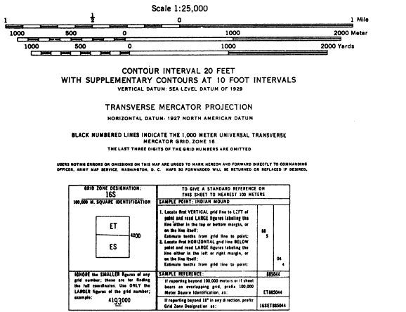 This procedure results in very large coordinate values when the coordinates are referenced to the point of origin. For example, for the bullion depository at Fort Knox, Kentucky, the coordinates of the lo-meter square in which the depository is located are casting 590,990 meters, northing 4,193,150 meters; however, since the grid zone-row designation pins the coordinate down to a relatively small area some of the digits of the coordinates are often omitted. Consider, for example, the part of a map shown in figure 9-16. The grid squares on this map measure 1,000 meters on each side. Note that the casting grid lines are identified by printed coordinates in which only the principal digits are shown, and of these, even the initial number 5 is in small type. The understood value of the number 589 is 589,000 meters. In setting down the coordinate for this line, even the 5 should be omitted and only the 89 written down.Similarly, in expressing the grid location of a point, some of the digits of the coordinates are often