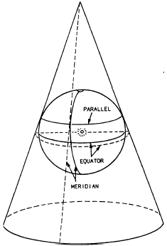 Figure 9-21.Appearance of meridians and parallels on a conic projection.indicate that the map covers parts of both. Note, too, that the direction of grid north (that is, the direction of the north-south grid lines in the map) varies from that of true north by O"39E and from the magnetic north by l"15W. |
