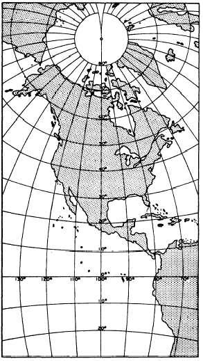 Figure 9-24.Polyconic projection of North America. showing areas extending for 730 of latitude and longitude. An index map is available, which gives you the quadrangle divisions and the name of the map that covers a particular area.That polyconic projection is not conformal distance-wise is indicated by the fact that one of these quad sheets, though it shows an area that is square on the ground, is oblong rather than square. The vertical or latitudinal length of the map is always greater than the horizontal or longitudinal length. The reason is that latitude is measured along a meridian, which is always a great circle, while longitude is measured along a parallel; and every parallel other than the equator is less than a great circle.An understanding of the concept of the great circle is essential to a thorough understanding of map and