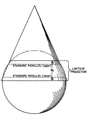 Figure 9-25.-Lambert conformal conic projection. chart projection. A great circle is any line on the earths surface (not necessarily a meridian or the equator) that lies in a plane that passes through the earths center. Any meridian lies in such a plane; so does the equator. But any parallel other than the equator lies in a plane that does not pass through the earths center; therefore, no parallel other than the equator is a great circle.Now, 1 minute of arc measured along a great circle is equal to 1 nautical mile (6076.115 ft) on the ground. But 1 minute of arc measured along a small circle amounts to less than 1 nautical mile on the ground. Therefore, a minute of latitude always represents a nautical mile on the ground, the reason being that latitude is measured along a meridian and every meridian is a great circle. A minute of longitude at the equator represents a nautical mile on the ground because, in this case, the longitude is measured along the equator, the only parallel that is a great circle. But a minute of longitude in any other latitude represents less than a nautical mile on the ground; and the higher the latitude, the greater the discrepancy. |