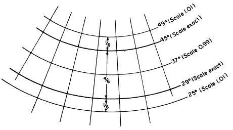 Figure 9-26.-distortion of the Lambert conformal conic projection with the standard parallels at 29 degrees and 45 degrees. directions. However, the distance scale that applies to the whole map is exact only at the standard parallels, as shown in figure 9-26. Between the parallels the scale is a little too small; beyond them, it is a little too large. The discrepancy is small enough to be ignored in work of ordinary precision or less. For work of higher precision, there are correction factors that may be applied.The Lambert conformal conic projection is the base for the state coordinate systems devised by the Coast and Geodetic Survey for zones of limited north-south dimension and indefinite east-west dimension. For zones whose greater dimension is north-south, the Coast and Geodetic Survey uses the transverse Mercator projection. |