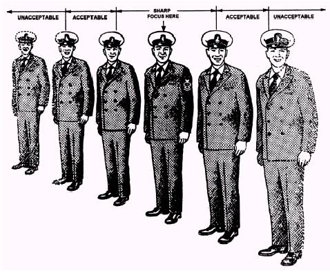 Figure 11-22. - Depth of field. lenses, is less for wider apertures and is less for shorter lens-to-subject distances. A peculiarity of the term depth of field is that it is usually used to define a condition of maximum depth of field; and when the depth of field is shallow or purposely restrictive, the term selective focus is used. Selective focus is merely "selecting" a depth of field that will satisfy a requirement to have the foreground, background, or both, not in sharp focus. The use of selective focus to make the main subject standout in the picture by being "sharp" while the rest of the image area is blurred is a good technique for gaining subject emphasis. The importance of proper focus and shutter speed cannot be overemphasized. Incorrect focus, subject movement, camera movement, improper use of depth of field, and so forth, can result in a blurred image on the photographic negative that cannot be connected in any way. Film latitude can take care of minor errors in the exposure, but there is no latitude for focus and stop action. An image is either in focus or out of focus; action is either stopped or blurred. |