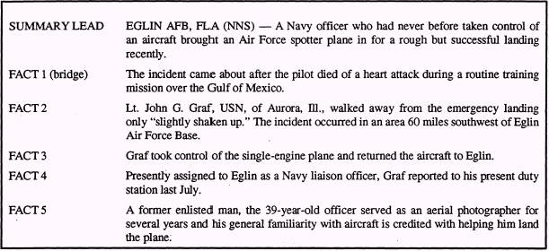 Figure 2-8. - Diagram of a straight news story. important incident, fact or detail, then the next important, and soon, until reaching the least important of all. At this point, the writer has reached the apex of the inverted pyramid with material of least value. The writer now knows that the makeup editor can slice one, two or three paragraphs from the bottom of his story without depriving the reader of the story's chief news elements. Figure 2-8 shows a diagram of a straight news story structure. A FINAL THOUGHT For several years, there has been a trend among civilian newspapers toward greater informality in news presentation. This trend has become known as "talking a story onto paper." Several years ago, an observant editor noticed that a reporter would come to the city desk and describe a story he has covered. The story would sound attractive