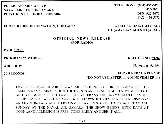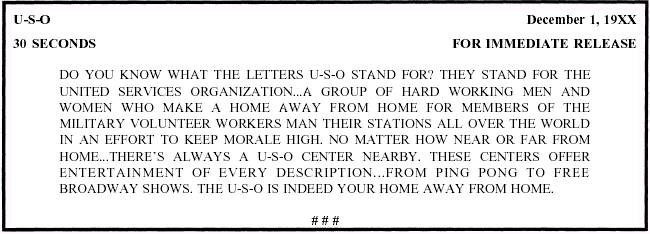 Figure 13-5. - 30-second information spot announcement. you may be allotted. Figure 13-5 shows the information spot announcement. SPOT WRITING TECHNIQUES In writing either a selling or information spot announcement, you should remember the following four techniques that will pay dividends in quality: 1. Plot the pitch carefully. Before you put a word on paper, you have to know the type of audience you want to reach. If the audience is in the lower income bracket, gear the spot to the special needs and wants of this group. One approach could be the economic security angle; another is the "get-ahead-in-the-world" appeal. On the other hand, audiences in small rural towns might find the travel theme exciting and interesting. Spot writers must study prospective audiences if they are to be successful at communicating with them. 2. Look for new target audiences. Although the stress in writing may be recruiting, you should be prepared to write spots that will sell the public on attending a command public visitation, a parade or a demonstration. These special events appeal to many audiences. Some spots might be directed toward fathers, children, teen-agers or even to mothers in the audience. 3. Develop a direct, personal writing approach. Even though the audience may consist of several thousand people, the copy is directed at one person. Make that individual feel that the message is personal. Address the listener in terms of "you," "you've," "your" Canal "you're." Always refer to the listener in singular form and in a friendly manner. 4. Select words carefully. Write spots in the active voice with such positive and colorful verbs as follows: go, see, take, try, get, visit, ask, call, be and buy. Be conversational, but avoid slang. Keep your words simple, and do not try to impress the listener with an extensive vocabulary. Speak to the listener in the language that person knows. You also should avoid special military terms and abbreviations that are unfamiliar to the listener. Format and Preparation Whether you are writing a spot announcement for an NBS detachment or a local commercial station, you should adhere to the following general rules concerning format and preparation: 1. Follow the appropriate style. Write your spot following the style guide of the station. A station manager might reject your spot if it is not in the style his announcers are used to reading. 2. Submit clean copy. All announcements you submit to radio stations should be free of errors. 3. Submit the proper number of copies. Check to see how many copies of an announcement each station needs. 4. Meet deadlines. If a station manager asks you to have a spot at the station by a given time, do not miss the deadline. Your violating this rule is the best way for you to keep your copy from ever reaching the airwaves. Timing the Spot Timing is extremely important in spot writing. On commercial stations, you will be competing with other public service agencies for free air time. Naturally, a station can allot only so much time for public service announcements. If you use music or sound effects in your spot, you must remember to take these into consideration in your timing. A 30-second spot with 10 seconds of sound effects averages four to five lines of copy. A stopwatch will help you in timing spots. Whenever you write a spot, it is best that you include a "kill date" and cutoff time so the station will know when to stop using it. A spot heard over and over, day after day for along time, soon gets dull and irritating to the listener. Also, if you have a spot telling people to visit your command on Sunday, it would certainly sound ridiculous to hear it the following Monday. |