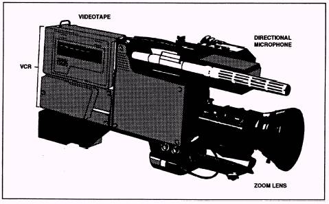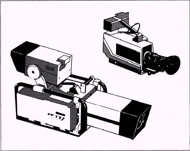 CONVERTIBLE CAMERA Some of the more expensive ENG cameras maybe converted from an ENG format to a studio camera head with a large viewfinder and advanced zoom lens. In terms of practicality, the convertible camera is tough to beat because you can use the same camera for two distinct applications. For instance, you can use a convertible camera to cover the 11 a.m. ribbon-cutting ceremony at the new Navy Commissary, then connect it to a CCU in the control room for the evening news six hours later. Furthermore, the convertible camera is invaluable for remote productions requiring several cameras, such as sporting and entertainment events. A convertible camera is shown in figure 14-6. CAMCORDER Unlike the standard ENG camera, which must be connected to the videocassette recorder (VCR) with a cable, the camcorder (fig. 14-7) combines a camera and a videocassette in one unit. The camcorder weighs less than an ENG camera and may be operated by one person. This allows increased mobility in tight ENG situations.