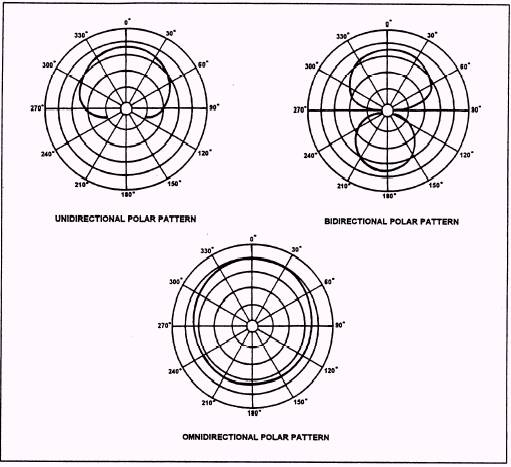 Figure 14-19. - Microphone polar patterns. POLAR PATTERNS The pickup, or polar pattern, of a microphone is the shape of the area around it where it picks up sounds with maximum fidelity and volume. Nearly all microphones can pick up sounds from areas outside the ideal pattern, but their quality is not as good. For best results, the sound source should be within the pickup pattern, generating enough volume to allow the audio switcher to keep the volume control pot at a minimal level. Microphones are classified according to the following three basic polar patterns: l Unidirectional l Omnidirectional l Bidirectional Unidirectional The unidirectional microphone picks up sound from only one direction. Because of this characteristic, the unidirectional microphone is used most frequently for television work. It is used by aiming it in the direction of the sound source being recorded. One advantage to the unidirectional microphone is its ability to reject unwanted sounds at the side and rear of the direction the microphone is aimed. Omnidirectional The omnidirectional (or nondirectional) microphone is live in all directions. This type of microphone has sensitivity characteristics in which sound is picked up in a 360-degree radius. The use of this microphone in television production is limited; however, in certain situations, you may use it to create a specific sound presence. One example is recording crowd noise for a sports production. Bidirectional As the name implies, the bidirectional microphone picks up sound in two directions. This type of microphone is used primarily in the broadcast or recording studio. It is also used for critical sound reinforcement applications in which front and rear