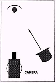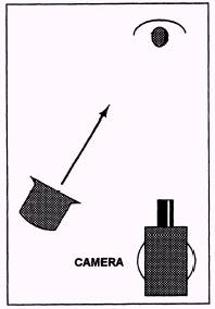 Figure 14-28. - Fill light. degrees. You may eventually make adjustment for any number of reasons, but this is a good place to start. Fill Light The fill light (fig. 14-28) fills in and softens the harsh shadows created by the key light. Position it on the opposite side of the camera from the key light and elevate it 30 to 35 degrees. Backlight The backlight (fig. 14-29) is used to separate the subject from the background by casting a rim of light across the head and shoulders of the subject. You should place the backlight at an elevated angle, but be careful not to light the top of the subject's head. A good starting point for the backlight is directly behind the subject, elevated 30 to 35 degrees. If your light is mounted on a stand, move it off to the side a little to get the standout of the picture. Use of the f/Stop Like any other camera lens, a television camera lens produces optimum results when stopped down one or two stops from its maximum aperture. Depth of field also is increased by stopping down. Therefore, your lighting should have sufficient intensity so you can stop down for the best picture possible.