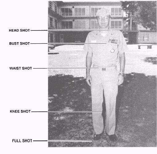 AREA OF TALENT INCLUDED The majority of your television pictures will be of people. Accordingly, it is convenient to identify people shots in terms of the portion of the body to be included in the frame. To help you recognize image size and to frame your talent effectively, you should use the cutoff line system (fig. 14-42). Cutoff lines are natural dividing lines that will help you produce aesthetically pleasing shots. Use the cutoff lines in the same manner as the six shot classifications previously covered. NUMBER OF TALENTS INCLUDED The shot designations that are easiest for you to remember are the ones that refer to the number of people to be included in the picture. When you shoot only one talent, it is termed a one-shot, two talents is a two-shot, three is a three-shot, and so forth. However, when five