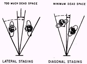 Figure 14-44. - Lateral vs. diagonal staging of talent. those for panning the camera. For example, the height of an object can be shown by gradually tilting up on it, or you could tilt down on something to build suspense. The director usually indicates to the camera operator the tilt he wants by ordering tilt up or tilt down. DOLLY. - Dollying is moving the camera toward or away from the subject. You can dolly in to increase gradually the size of an object on the screen, or dolly out to produce an opposite effect. Likewise, dollying decreases or increases the field of view. The director's orders for dolly are dolly in or dolly out. ZOOM. - A zoom is made with a zoom lens. It looks like a dolly and is used for the same purpose. During a zoom the camera does not move; therefore, perspective does not change as it does during a dolly. The director orders zoom in or zoom out. TRUCK. - Trucking is the lateral movement of the camera. It is used to follow lateral subject movement or to truck the camera parallel to stationary objects. In either case, camera-to-subject distance does not change. Truck left or truck right are the director's orders to the camera operator. PEDESTAL. - When the director calls for a pedestal, the entire camera is either raised or lowered on the pedestal. Pedestaling can provide the audience with a high or low perspective of the subject. The pedestal also can be used to compensate for tall or short camera operators or talents. Pedestal up or pedestal down are the director's commands.