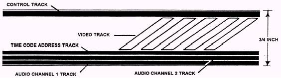 Figure 14-46. - Track location on a 3/4-inch U-Matic videotape. Audio Track Virtually all formats of videotape provide at least two distinct areas for the recording of audio information. They are placed indifferent locations on the videotape but perform the same as regular audiotape. Control Track The control track consists of electronic blips or spikes, called sync pulses, recorded in precise intends of one-thirtieth of a second. Since it provides the necessary foundation for the editing process, you cannot edit without a control track on your blank (source) tape in the insert edit mode. The insert edit mode is explained later. Laying the control track on a blank videotape is the first step in the videotape editing process in the insert edit mode. Most television studios have a "black burst" generator that produces a crystal black signal you may record and use as a control track. You also can record a control track from another tape - for example, a tape that has color bars and tone. Time Code Address Track The time code address track is used to record cuing information for editing. This information may consist of audio or visual time/frame identification. Figure 14-46 shows the location of all four tracks on a 3/4-inch U-Matic videotape. |
