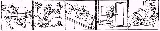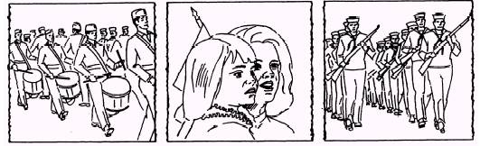 Figure 14-50. - Crosscutting. CROSSCUTTING. - Crosscutting is the old standby of videotape editing. In crosscutting, you use shots from two different actions or events that will finally be related. A time-honored example is the "meanwhile, back at the ranch" style, or the hero riding hard to save the life of the heroine who has been chained to a buzz saw by the villain (fig. 14-50). The action would be cutback and forth between the desperate rider and the saw as it comes dangerously close to the heroine's head, showing the progress of each, then finally relating them as the rider arrives at the last moment to save the heroine. Compilation Cutting The second method of videotape editing is compilation cutting. This is used in documentary-style stories of surveys, reports, history or travelogues. Segments are tied together through narration. The narrative explains the shots, which may have little or no matching relation. These shots or scenes maybe long or short shots, or they may go from longshots to close-ups without any special transitions. |