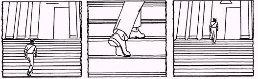 Figure 14-49. - Cut-in. Continuity Cutting Continuity cutting is the most commonly used method of editing videotape for news or feature releases. It is used when the storytelling is dependent on matching consecutive scenes. Continuity cutting consists of matched cuts in which continuous action flows from one shot to another. The three transitional devices associated with continuity cutting are the cutaway, cut-in and crosscutting. CUTAWAY. - When the action shown is not a portion of the previous scene, a transitional device, known as a cutaway, is used to change positions, movements or characters or to denote a lapse of time. This eliminates a mismatch, or jump cut, that would cause the segment to appear jerky or out of sequence. Cutaways are often termed protection, reaction, insert or cover shots and are thought of as secondary action shots. For example, if the main thought is centered around a parade, cutaways might consist of closeup shots of the crowd Children may be shown watching intently, eating candy or applauding; adults may be wearing different expressions of emotion or carrying children on their shoulders (fig. 14-48). These shots are of human interest and are related to the main story, but are not actually a primary part of it. If you have a good selection of cutaways, often you can make a marvelous story out of an otherwise drab and commonplace event. The cutaway can cover a multitude of camera operator errors and result in the formulation of an exciting segment. Cutaways should last between three and five seconds. CUT-IN. - Another method used to denote a lapse of time is the cut-in. Unlike the cutaway, the cut-in is a part of the primary action, rather than the secondary action. For instance, to denote a person climbing a long flight of stairs, you establish the individual at the start of the climb, then cut to a close-up of feet as they take the steps. After you establish the shot (three to five seconds), you cut back to the person at the top of the stairs (fig. 14-49). A person can appear to walk a city block in just a few seconds by showing feet walking or a hand carrying a briefcase.